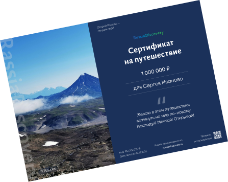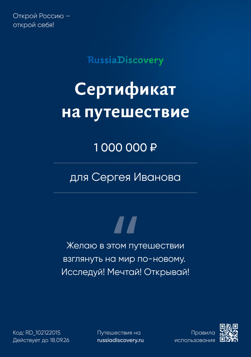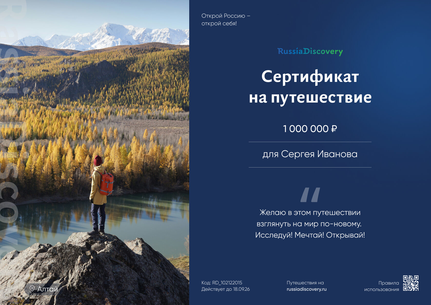 Сертификат на путешествие с RussiaDiscovery — больше, чем подарок. Он универсален, ведь получатель сам выбирает маршрут, и уникален, потому что каждое приключение — это личная история, которая не повторяется дважды. Подарите не вещь, а исполнение мечты — воспоминания, которые останутся на всю жизнь.